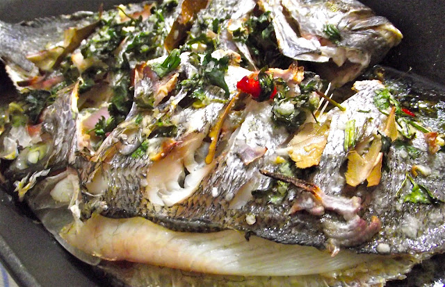 O forno é, muito possivelmente, a melhor parte de qualquer cozinha. E nunca antes tinha pensado nisso. Dele saem pães, bolos, tartes, scones, gratinados, soufflés e...  assados. Não consigo lembrar-me da nada que não goste neste capítulo. Carne assada no forno, batatas a murro, tabuleiros de bacalhau no forno, tudo é muito bom mas quase nada supera um bom peixe assado inteiro com muitas ervas e sabores. Prefiro-o grelhado sobre brasas mas, à falta de grelhador num apartamento (e sem varandas), o forno é dos meus melhores amigos!